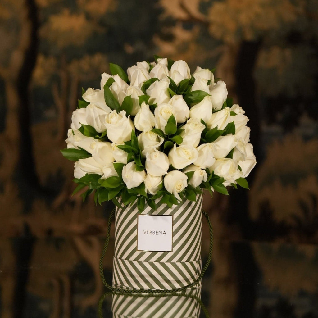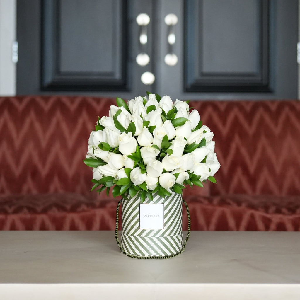 A composição é montada com 80 rosas brancas frescas. Um arranjo atemporal, que expressa leveza e elegância em cada detalhe.