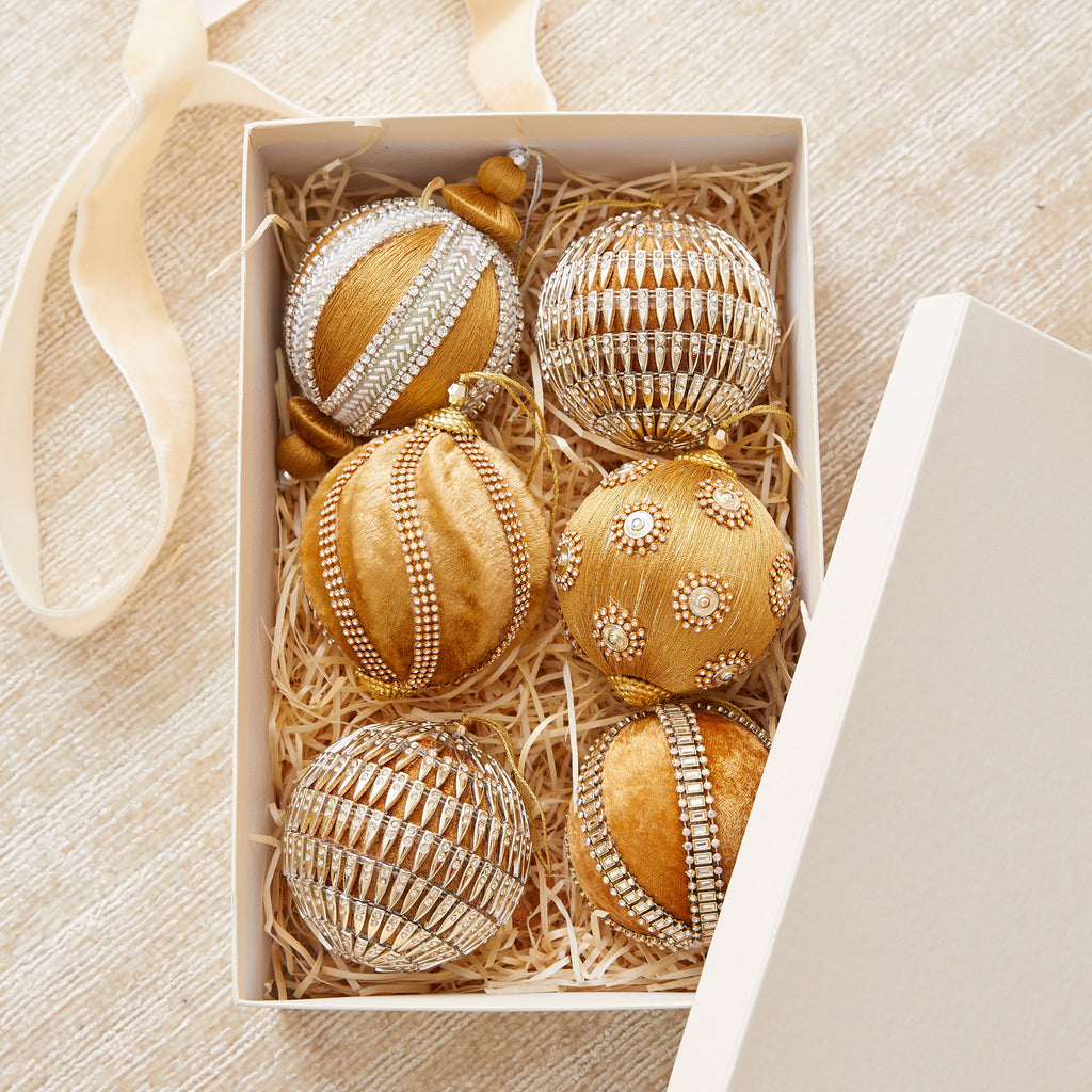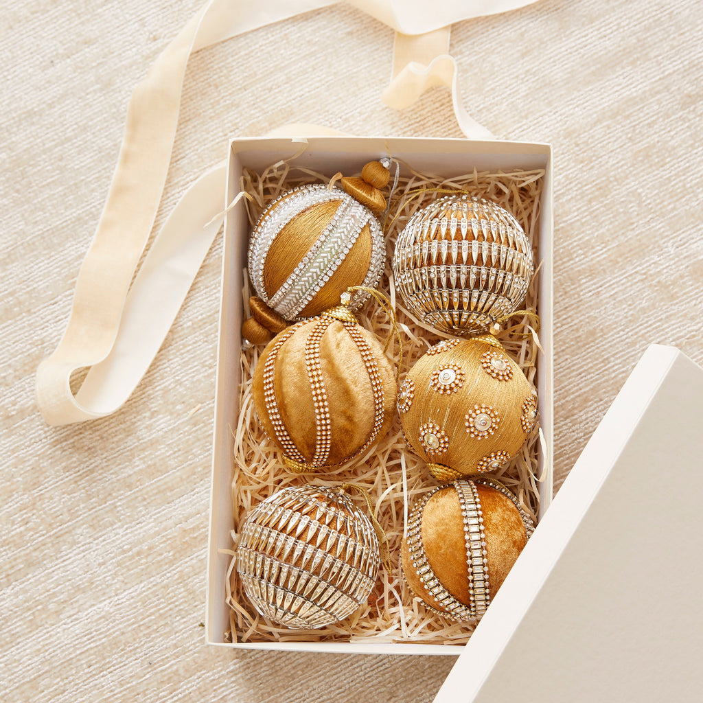 6 Bolas Golden Grace em veludo/linho bordado à mão, com fios dourados e aplicações de pedras (10 cm cada)