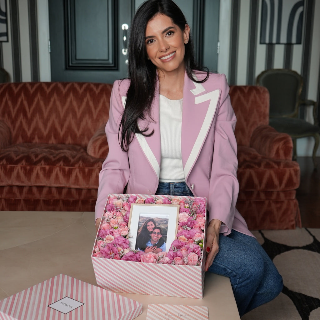 • 1 Caixa estampada grande em tons suaves de rosa e branco, com flores naturais coordenadas