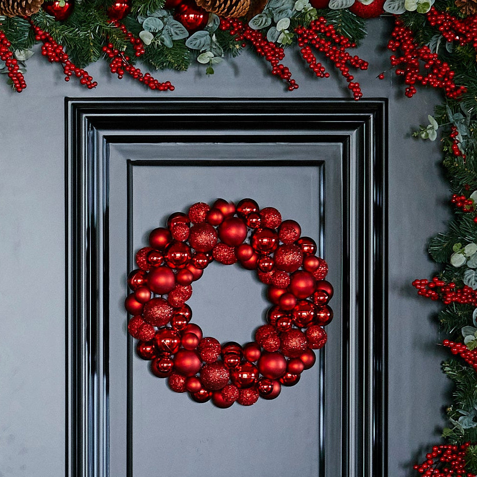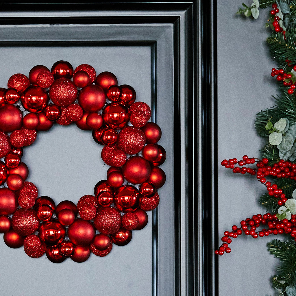 Guirlanda com bolas de Natal em diferentes tamanhos e texturas na cor vermelha. É perfeita para quem busca um toque clássico e sofisticado na decoração natalina.