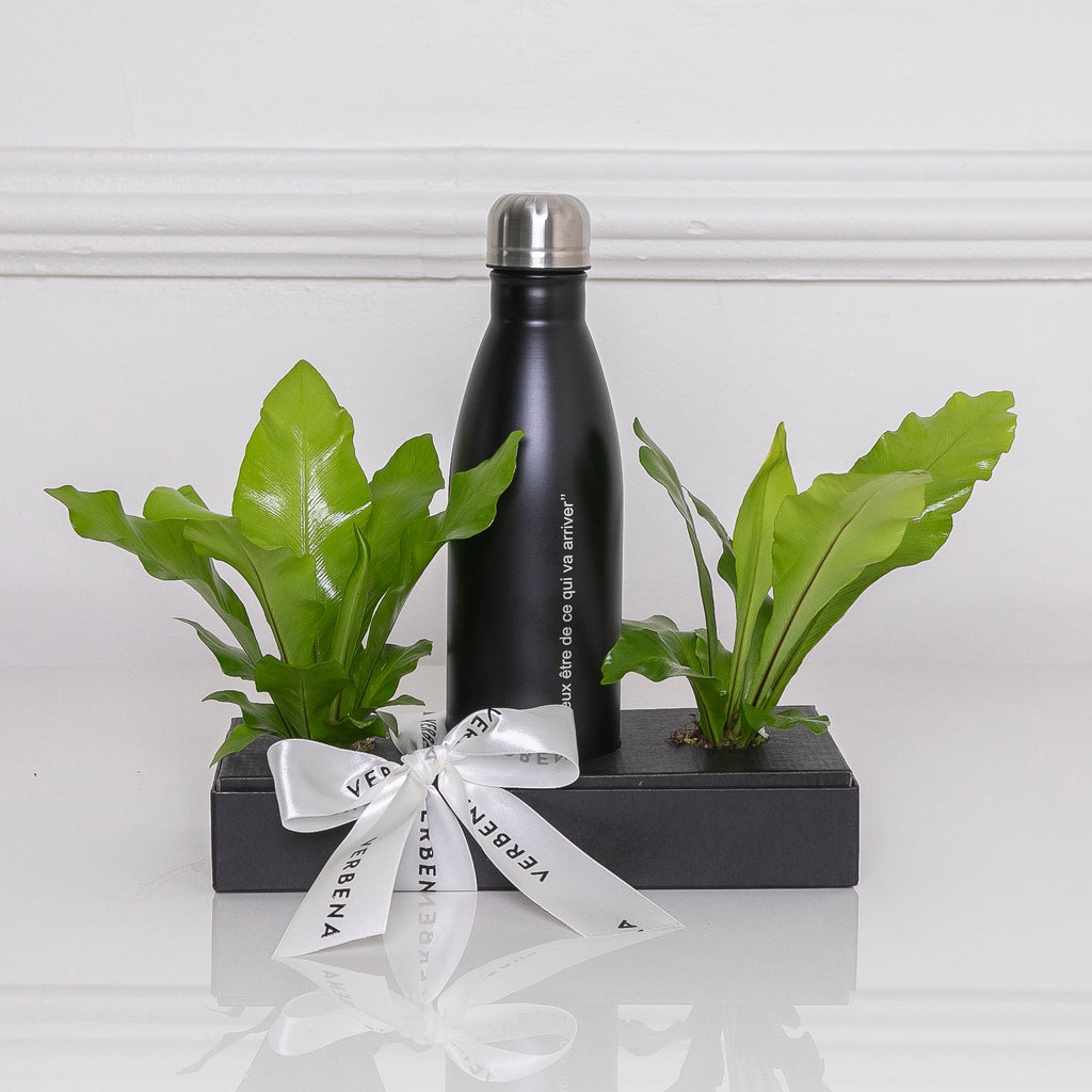 A caixa Verbena acompanha uma garrafa de água em inox com a frase