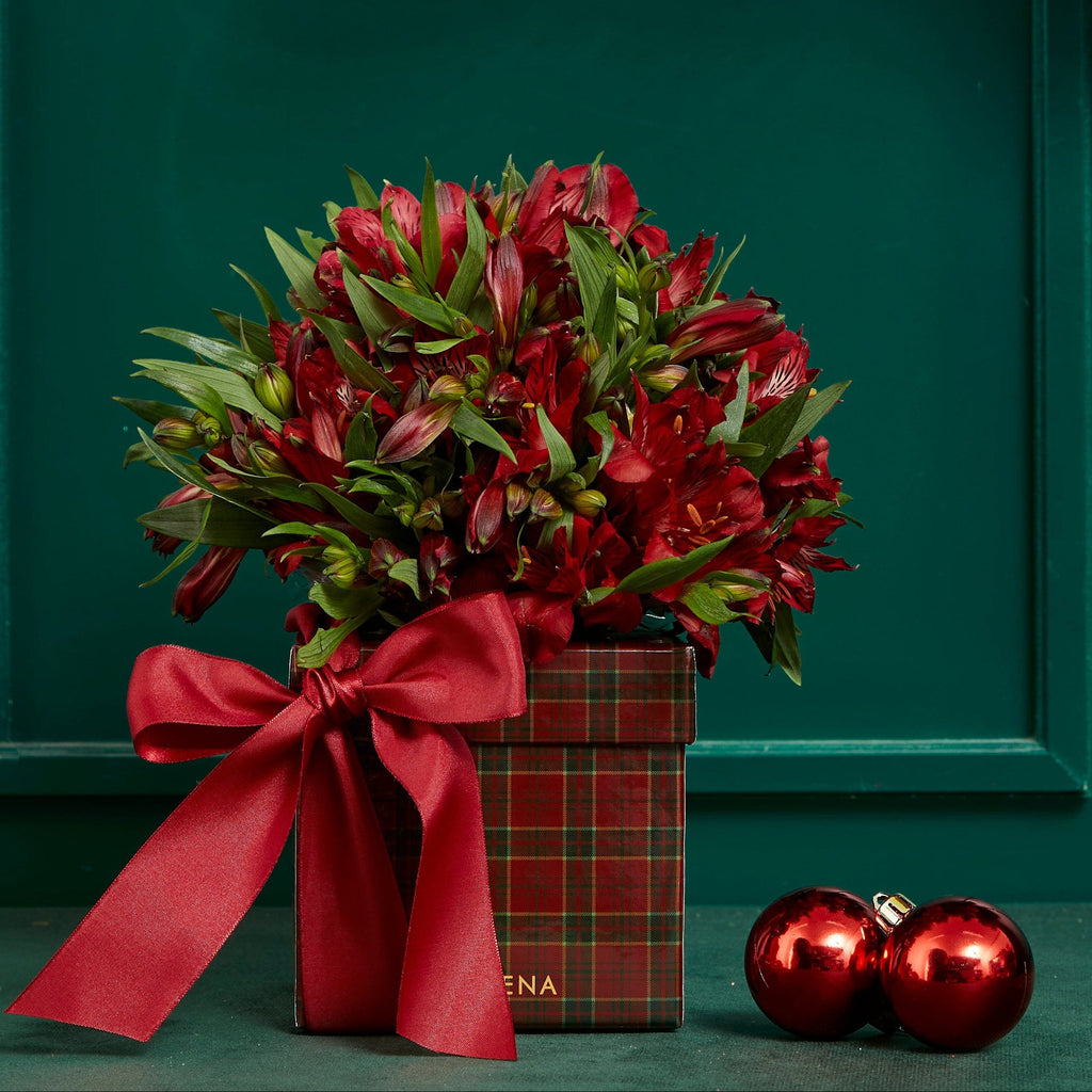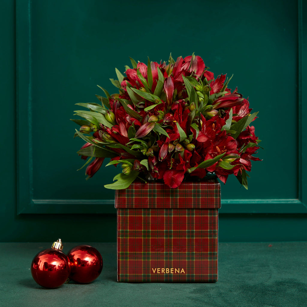 CAIXA TARTAN COM ALSTROEMÉRIAS VERMELHAS