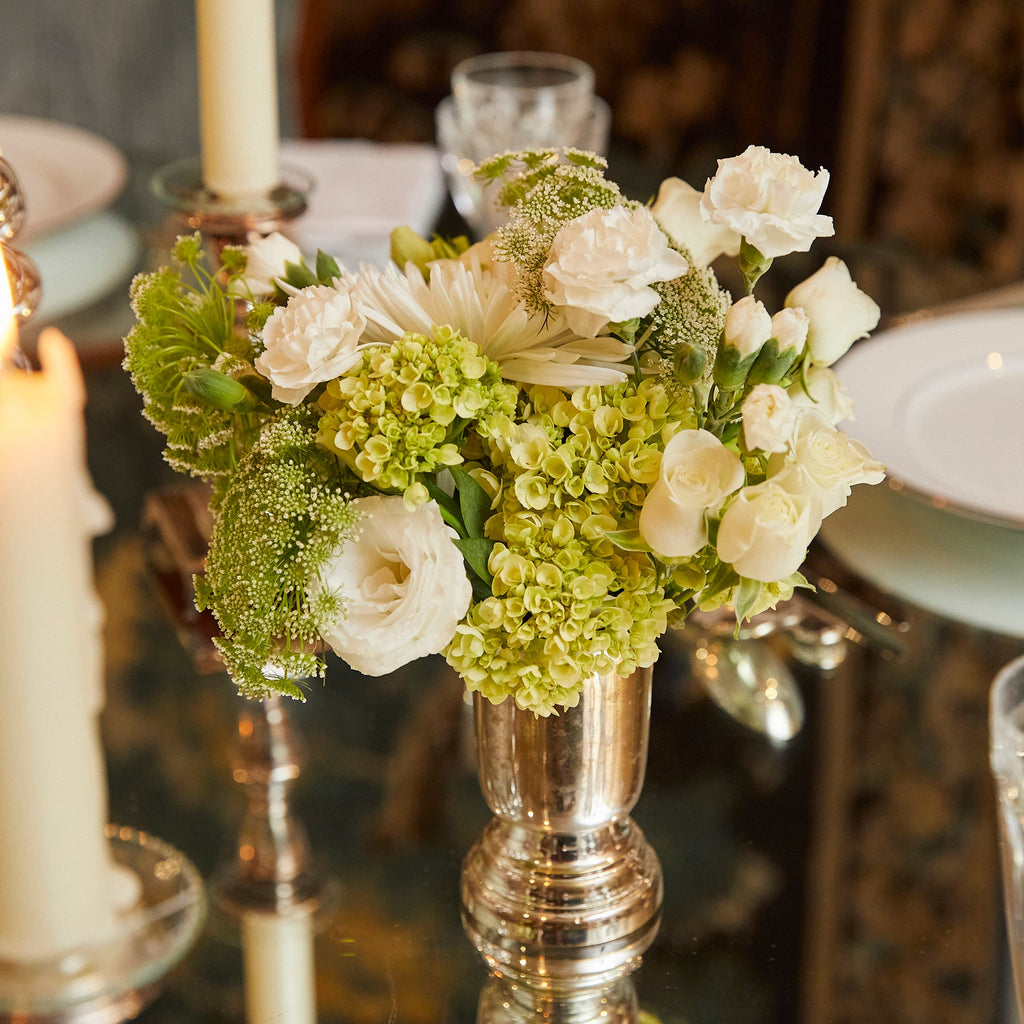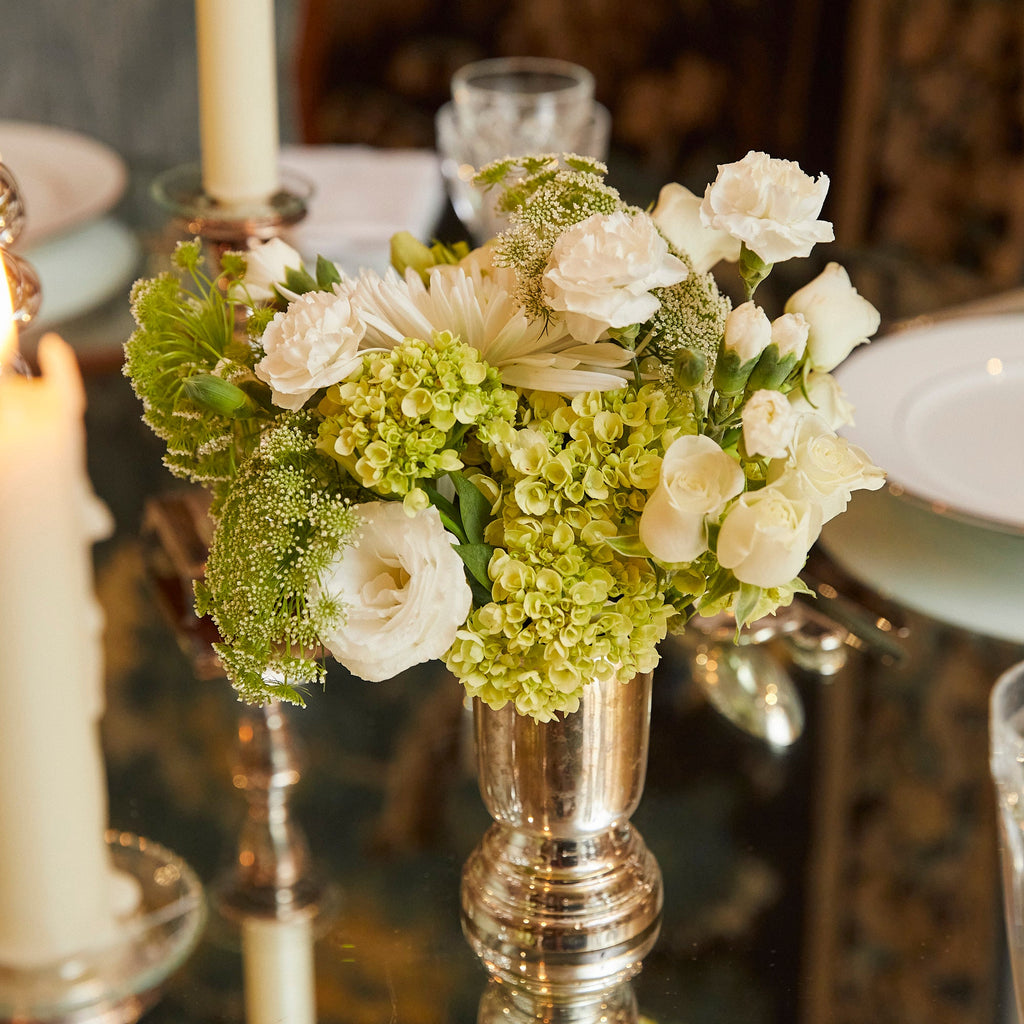 Arranjo composto por mini rosas premium, hortênsias, lisiantos, flores-de-cenoura e anastácias em tom off-white.