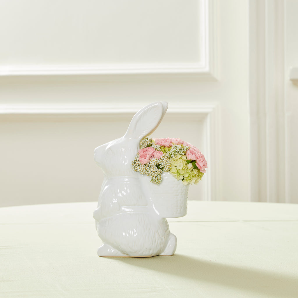 • Coelha Olivia em cerâmica branca com cesto montado com flores em tons de rosa