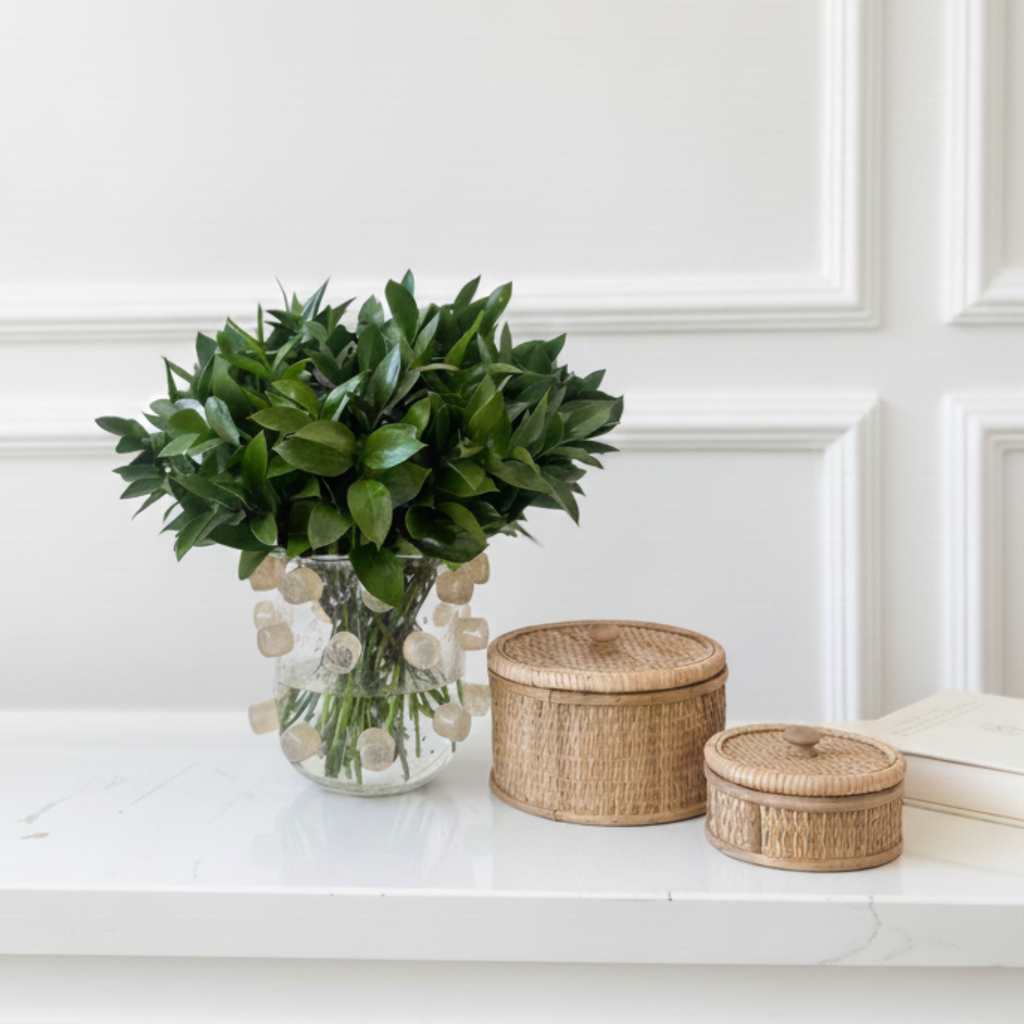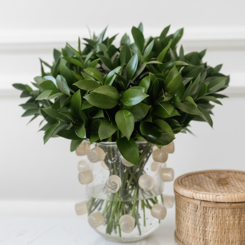 - Vaso Pompideau M com ruscus: um toque natural com essa folhagem que possui excelente durabilidade. Recomendamos a troca da água do vaso de 1 a 2 vezes na semana.