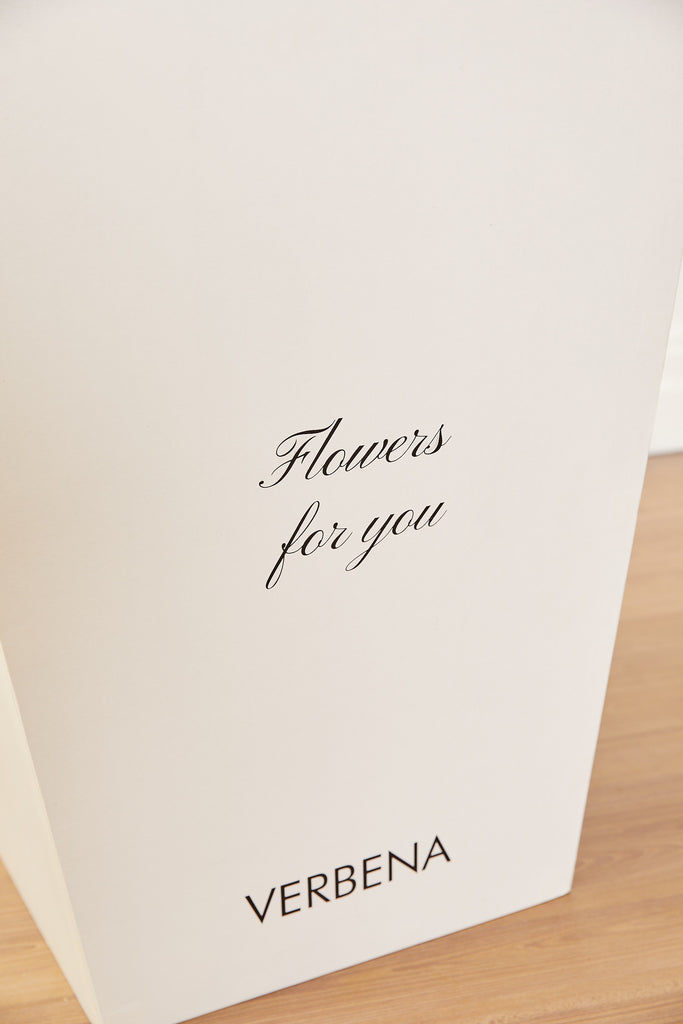 – 1 caixa branca VERBENA com a frase “Flowers for You”