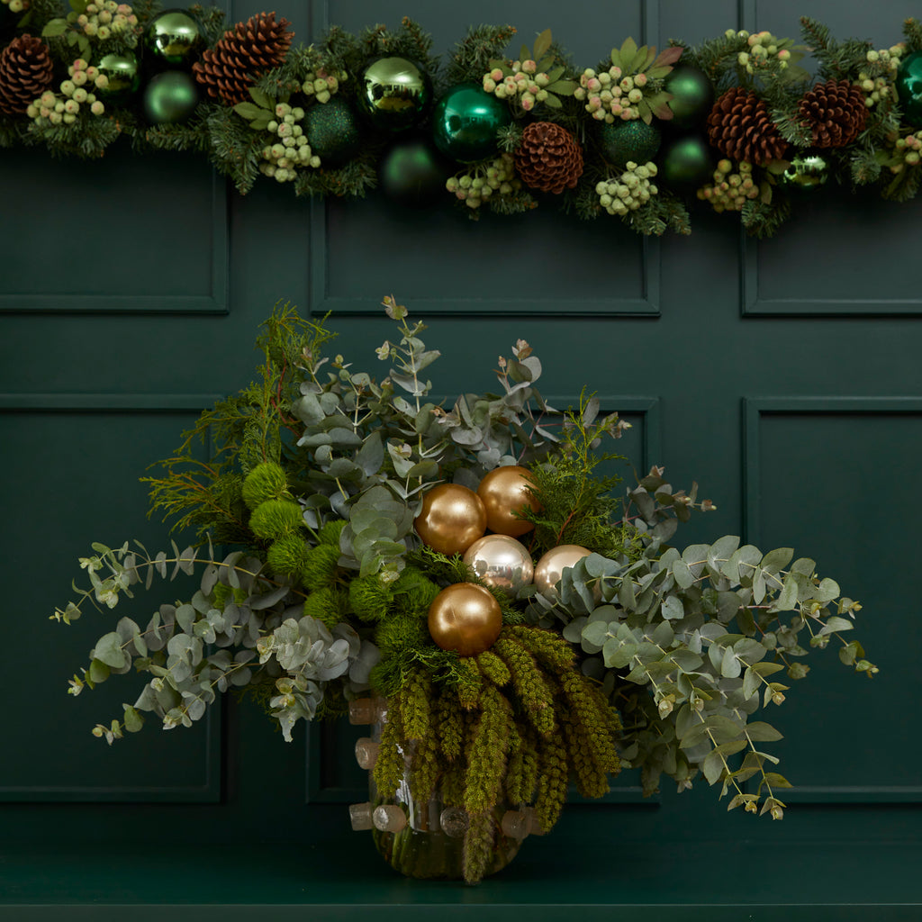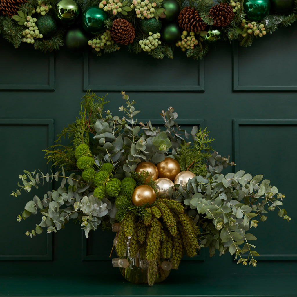 A composição floral — com diferentes espécies de folhagens e flores em tons de verde, intercaladas por bolas douradas — oferece uma leitura moderna e sofisticada do Natal clássico. Um arranjo para surpreender.