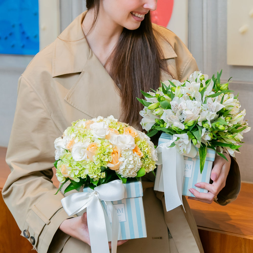 Composição: 2 caixas quadradas com estampa de listras, com a frase “Mom, I Love You”, sendo uma com mix de rosas chá, hortênsias e lisianthus frescos, e outra com alstroemérias brancas frescas.