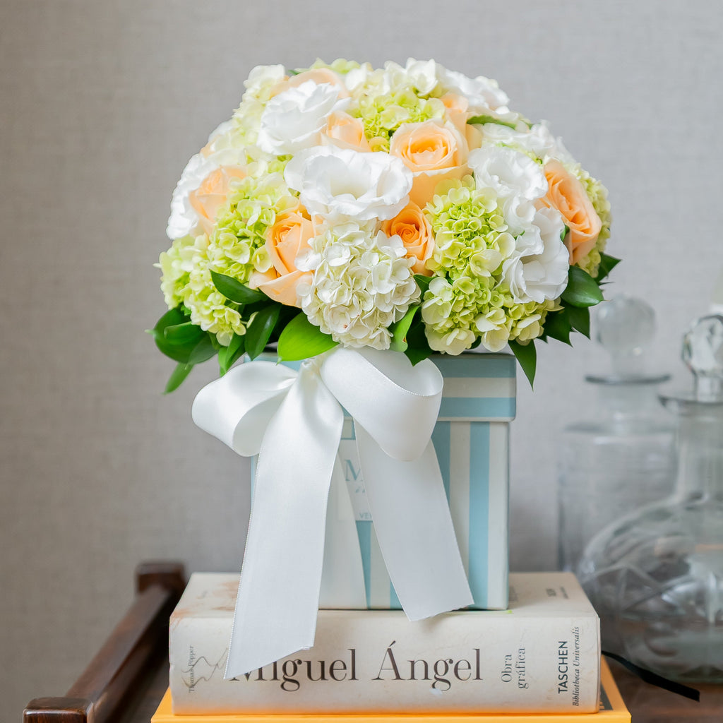 De um lado, rosas chá, hortênsias e lisianthus em tons suaves, trazendo frescor e aconchego. Do outro, alstroemérias brancas, leves e elegantes, que complementam o conjunto com serenidade.