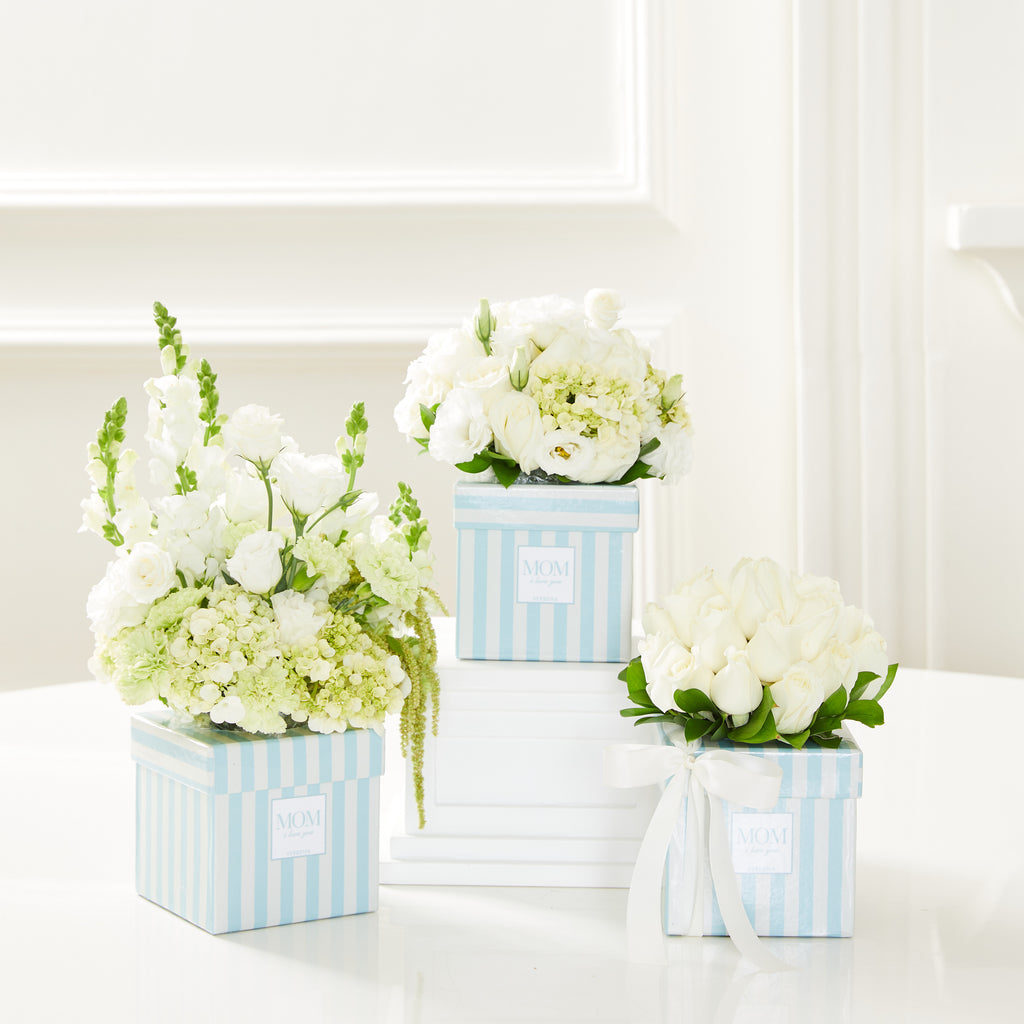 O trio Mom, I Love You reúne três caixas quadradas com estampa exclusiva de listras em tons de off-white e azul — um design clássico, delicado e atemporal, criado especialmente para o Dia das Mães.