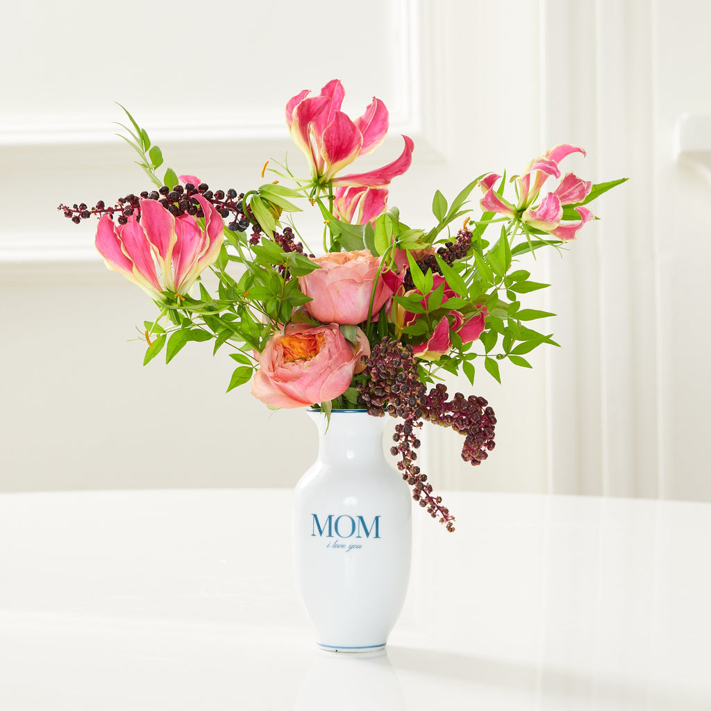 – 1 vaso de porcelana branca com a frase “Mom, I Love You” e mix de flores