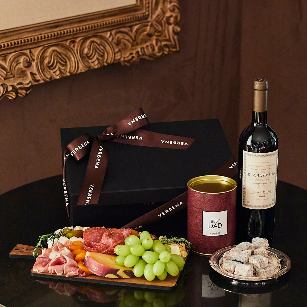 A beautiful and delicious gift for your father. Box with wine, cold cuts and chocolates.