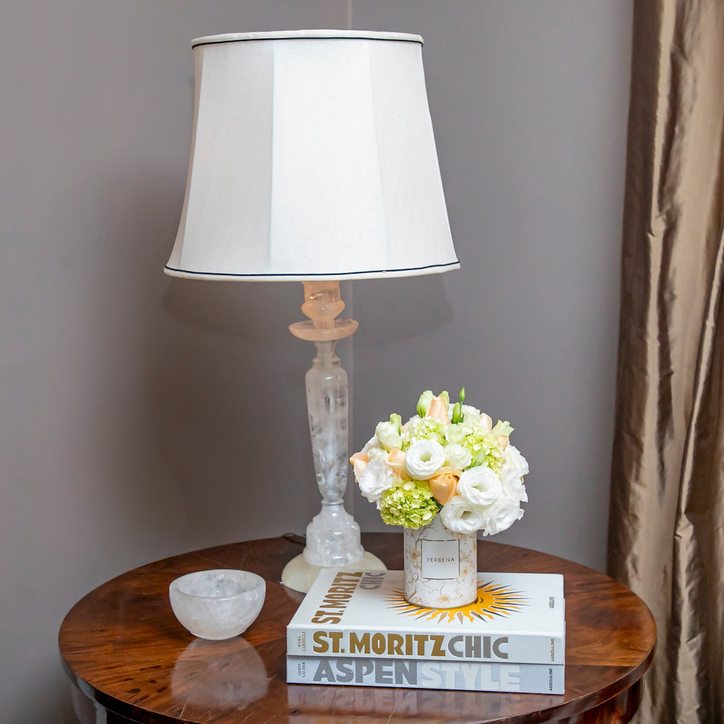 • Lata redonda tamanho P com mix de rosas champanhe, lisianthus branco e hortensias.