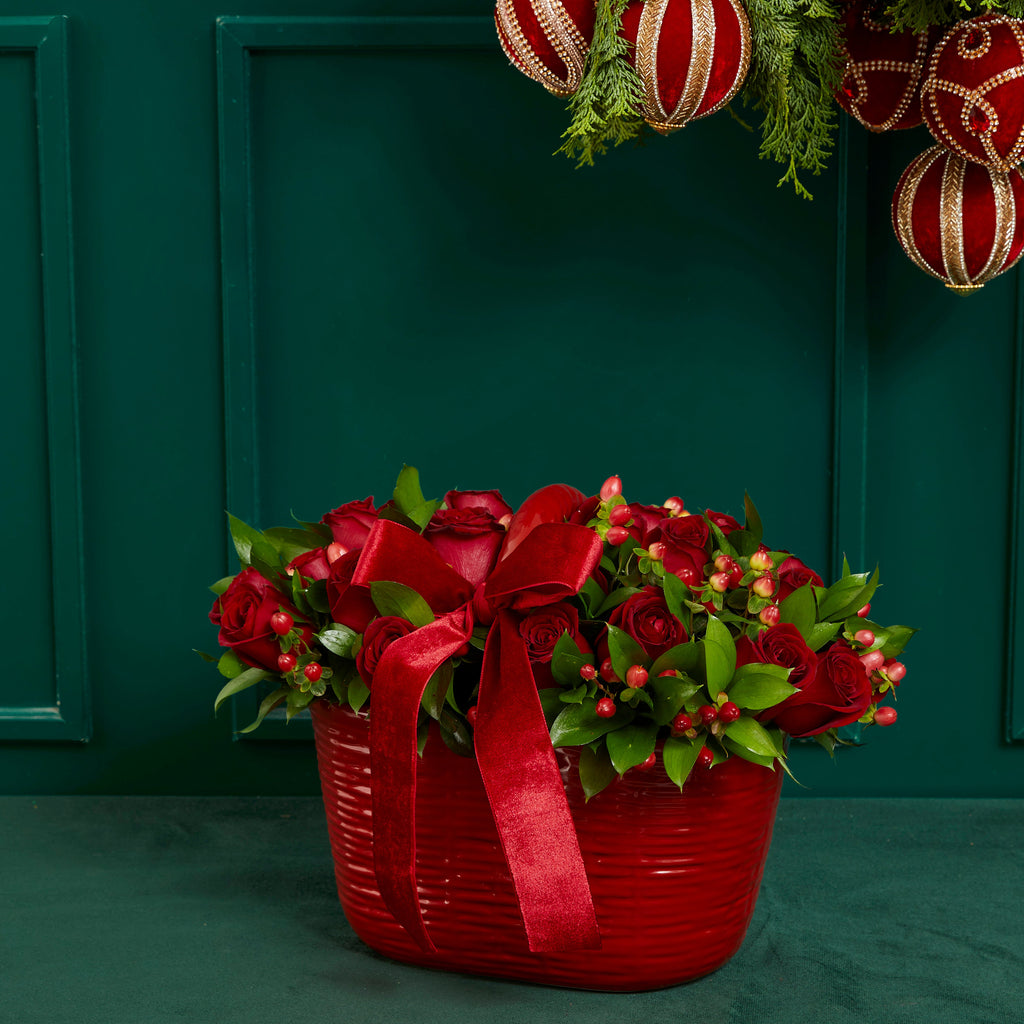A Amelia Bag é uma cesta grande em cerâmica em tom de vermelho, com alça também em cerâmica, montada com rosas, folhagens naturais e flores de Natal. O acabamento em laço de veludo, no mesmo tom da cesta, reforça a harmonia e o estilo atemporal que definem o Natal Verbena.