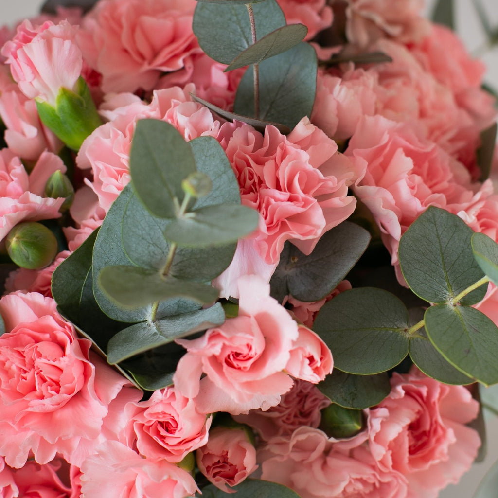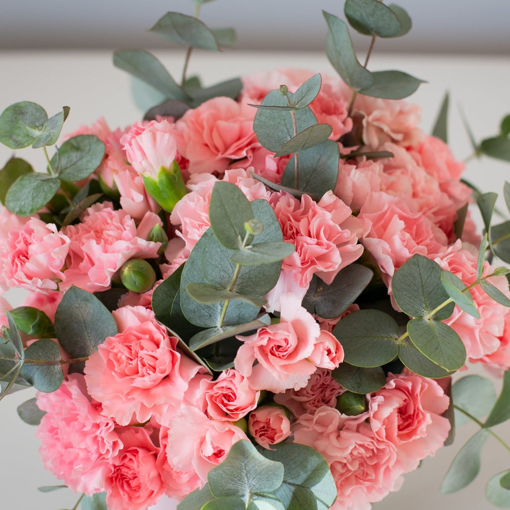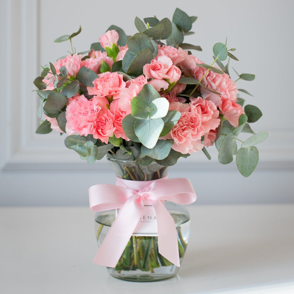 Composição: Vaso de vidro de vidro com cravina e folhagens.